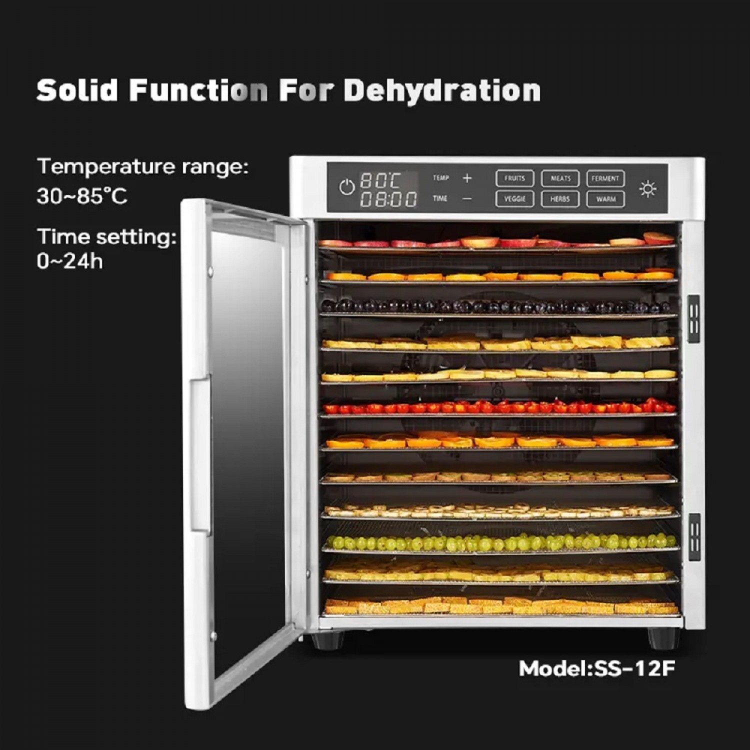 Αφυγραντήρας τροφίμων & φρούτων με 12 σχάρες (30x28cm), ικανότητα έως 6Kg. Διαθέτει μενού και LED φωτισμό. Κατασκευασμένος από ανοξείδωτο ατσάλι εσωτερικά και εξωτερικά, με σχάρες AISI304. Η πόρτα διαθέτει τζάμι για καλύτερη παρακολούθηση. Περιλαμβάνει ρύθμιση χρόνου από 0 έως 24 ώρες και έχει επίπεδο θορύβου 50-55 decibels (εκτός του μοντέλου SS-06B, όπου είναι 45-50 decibels). Διαθέτει διπλούς τοίχους και ψηφιακή οθόνη ελέγχου και ρύθμισης. Οι διαστάσεις του είναι 345x395x410mm και η ισχύς του είναι 0.8KW.